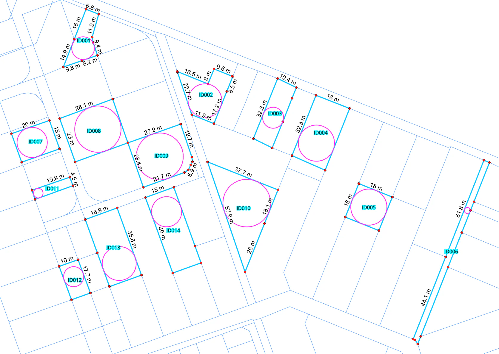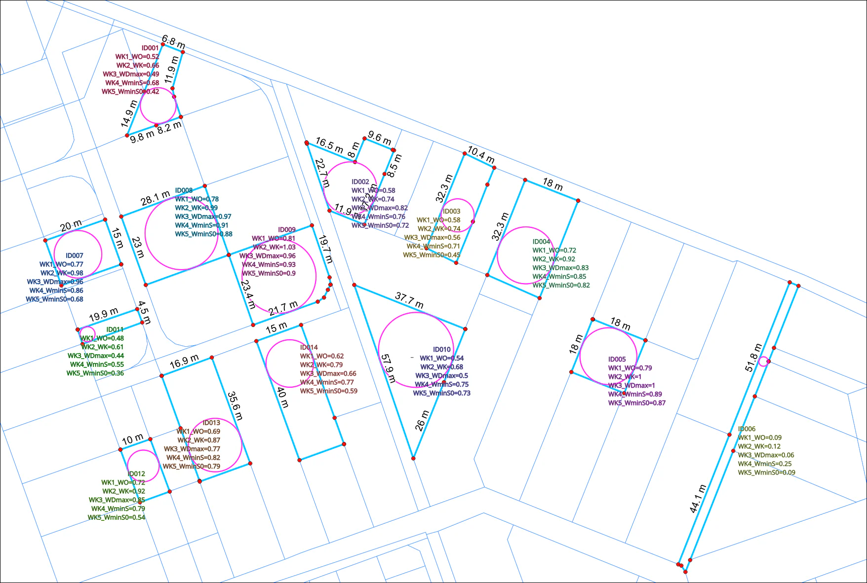 Pomocniczo przedstawiono również największe wpisane okręgi, aby zobrazować minimalną szerokość działek przyjętą do obliczeń. To podejście nieco odbiega od pierwotnego założenia autora współczynników opartych na minimalnej szerokości działki. Dla przykładu, w przypadku trójkątnej działki pierwotna szerokość według artykułu wynosi 0 m, podczas gdy w omawianym rozwiązaniu jest to niemal 24 m – wskazując tym samym fragment działki, który rzeczywiście nadaje się do zagospodarowania w ramach całkowitej powierzchni nieruchomości.