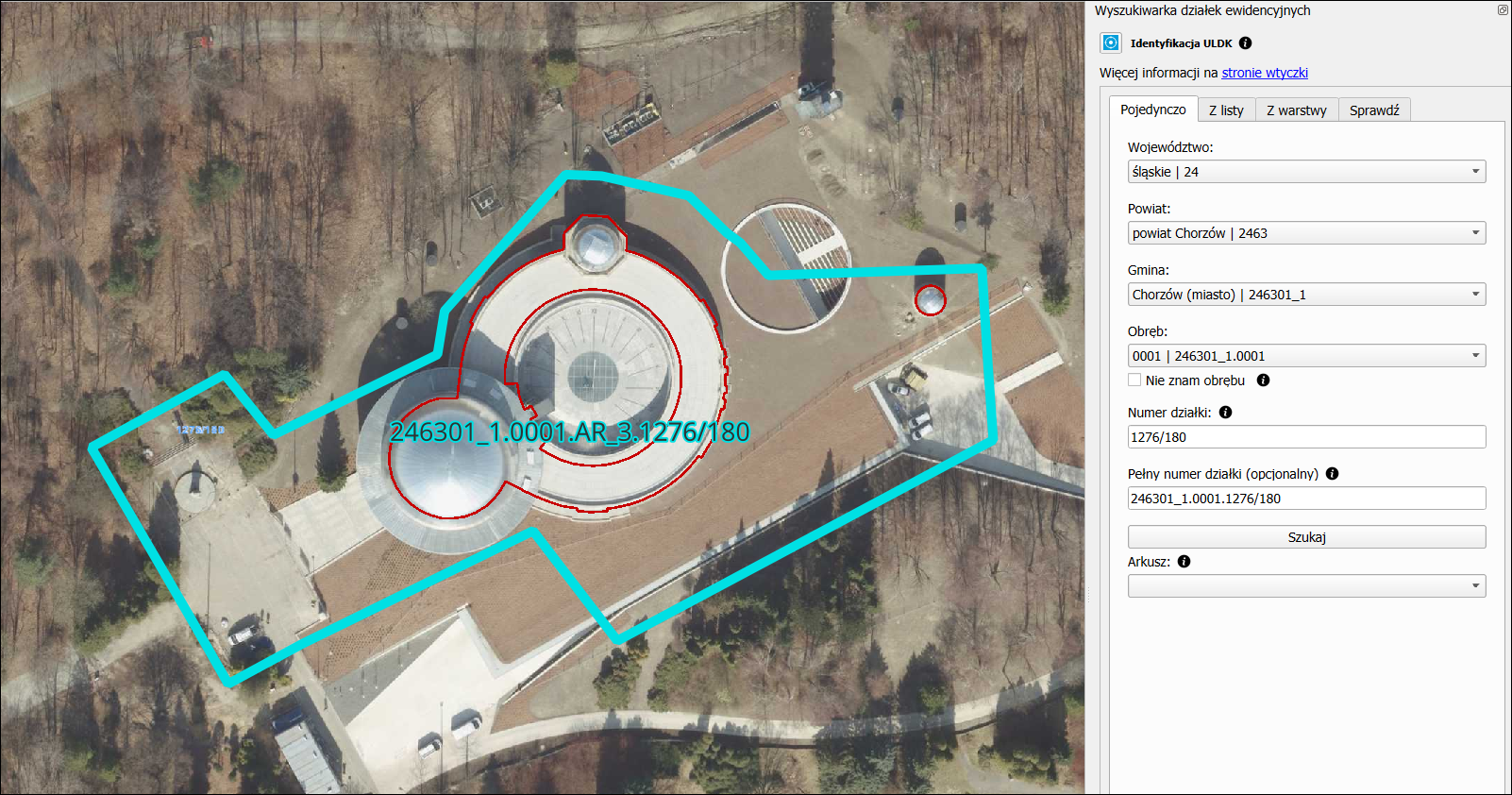 GIS SUPPORT - to polski dodatek, stworzony przez firmę o takiej samej nazwie tj. GiS Support. Pierwszy jej moduł, który zaciekawi rzeczoznawcę to Wyszukiwarka działek ewidencyjnych. Umożliwia on wyszukiwanie działek (i pobieranie dla nich geometrii) pojedynczo (podobnie jak to działa na portalach powiatowych), z listy wielu działek (kiedy dysponujemy ich identyfikatorami i chcemy wyszukać automatycznie dużo działek) lub wielu działek przecinających zadaną geometrię. Możemy też użyć modułu Identyfikacja ULDK żeby wskazać na mapie i pobrać konkretną działkę.