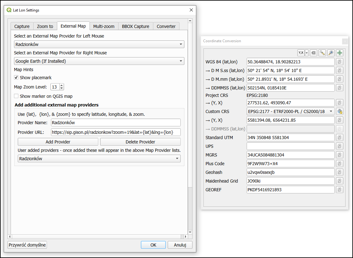 LAT LON TOOLS - to wtyczka, która upraszcza zarządzanie współrzędnymi geograficznymi, oferując narzędzia do ich przechwytywania, konwersji i wyświetlania w różnych formatach. Umożliwia przechwytywanie zarówno współrzędnych punktowych, jak i zakresów mapy, warstw lub wybranych obiektów. Narzędzie pozwala również na otwieranie zewnętrznych serwisów mapowych po kliknięciu prawym lub lewym przyciskiem myszy (podobnie jak w przypadku wtyczki POWER PIN PL). Możliwe jest także uruchomienie aplikacji Google Earth Pro, jeśli jest zainstalowana na komputerze. Dodatkowo, użytkownik może zdefiniować własny odsyłacz do zewnętrznego serwisu (np. geoportalu powiatowego lub gminnego). Warunkiem jest, aby dany portal umożliwiał wyświetlanie lokalizacji mapy na podstawie współrzędnych podanych w linku do witryny.